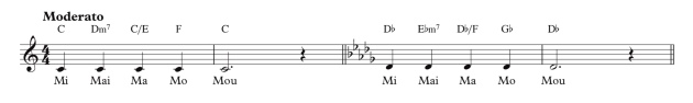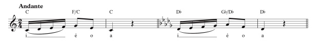 Réveil corporel avec imprégnation de cellules rythmiques sur 3 temps par mimétisme (travail rythmique préparatoire à la mise en place d'un ostinato rythmique). Cellule rythmique de référence :